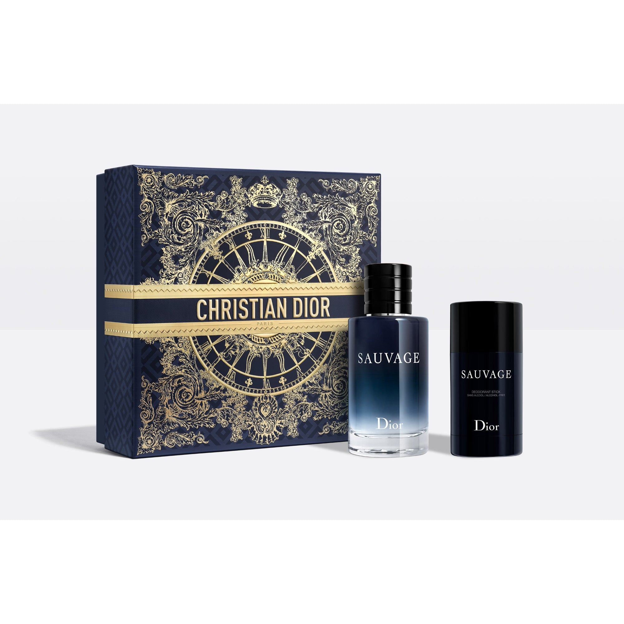 Description: This gift set created for the holiday season features two Sauvage creations, including the iconic eau de toilette. Together, these products can be used to create a daily fragrance ritual. A gift idea for men by Dior. The selection includes: - Sauvage Eau de Toilette, 100 ml. The Dior eau de toilette with fresh, citrus and woody notes, and with a refillable bottle. - Sauvage Deodorant, 75 g. A deodorant stick that protects the skin against odors and subtly scents it with the notes of Sauvage.
